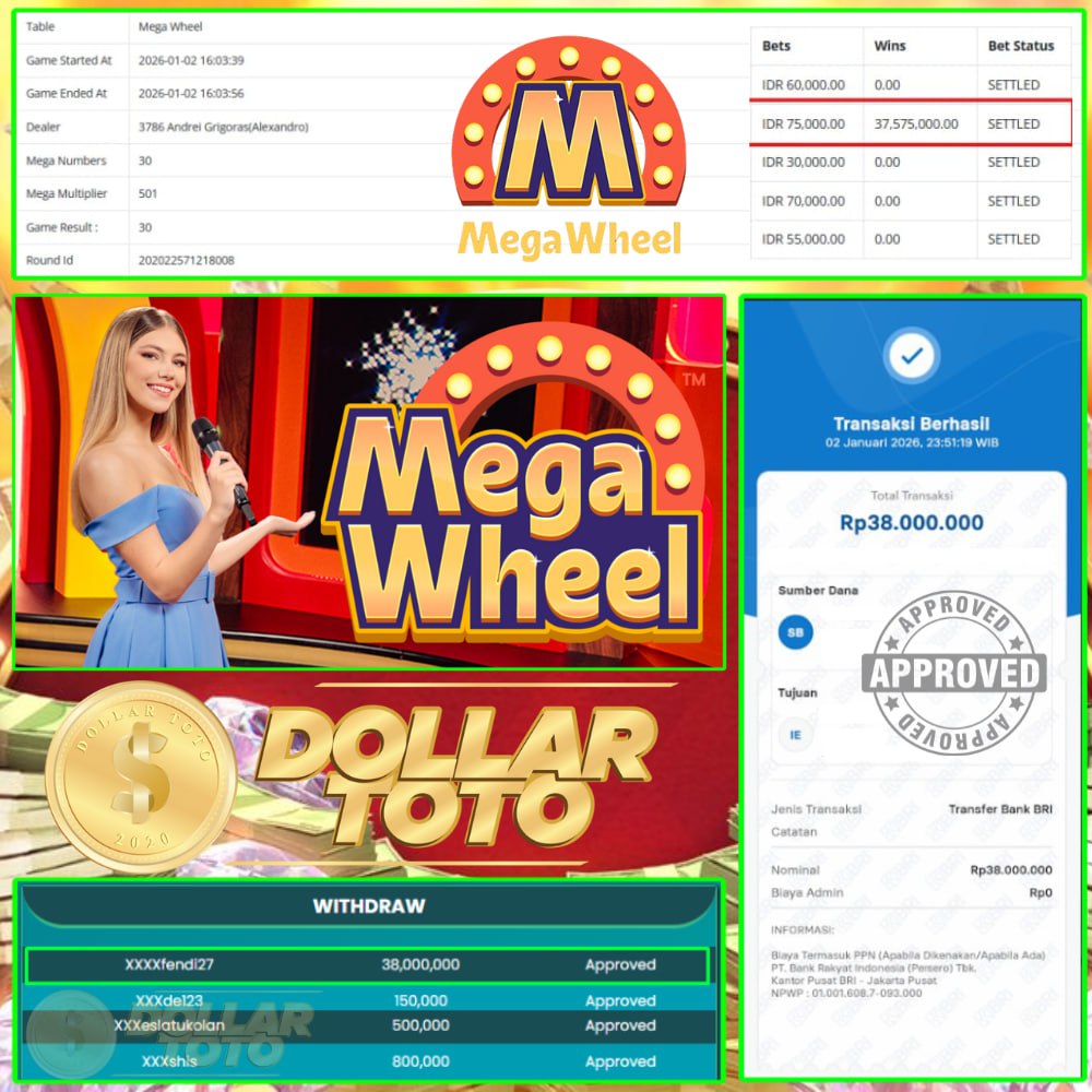 Selamat Kepada Member DOLLARTOTO dengan User ID XXXXffendi27 yang Kembali Meraih Kemenangan Dari Game MEGA WHEEL – PRAGMATIC LIVE.