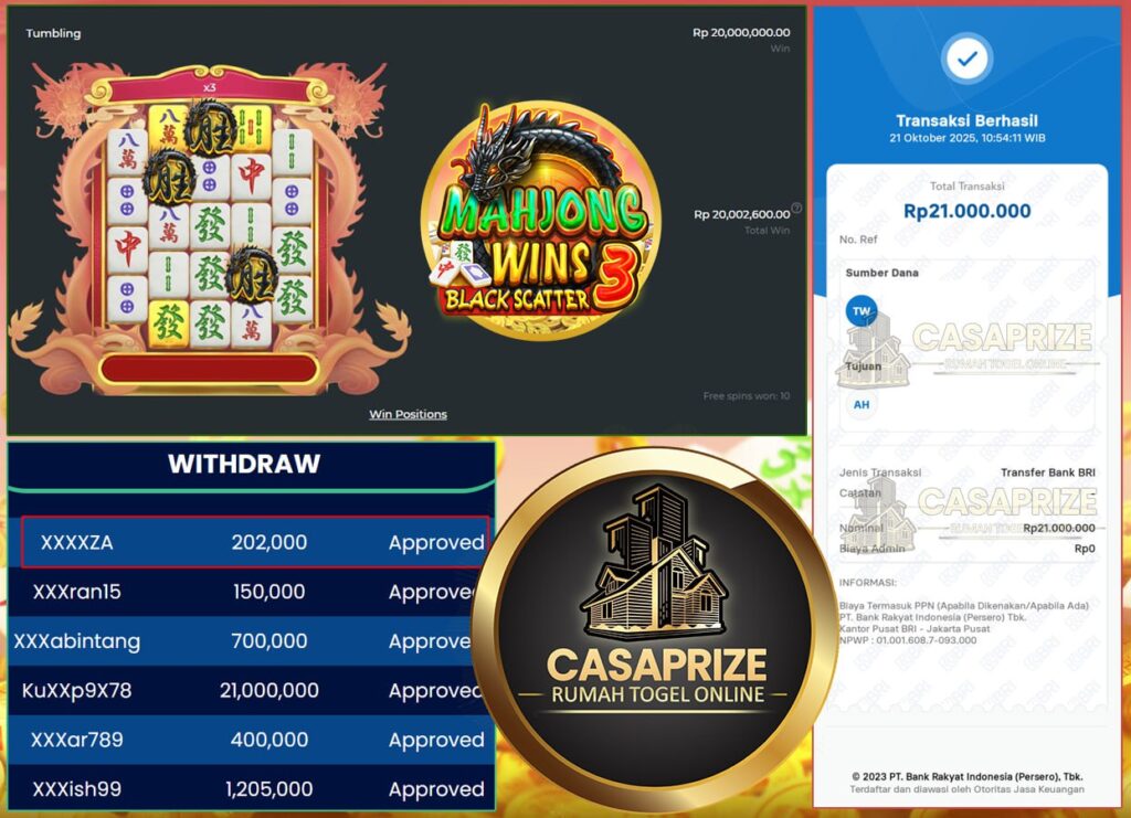Selamat kepada member setia CASAPRIZE dengan User ID: XXXXZA yang sukses meraih kemenangan SENSATIONAL di permainan MAHJONG WINS 3 BLACK SCATTER – PRAGMATIC PLAY.