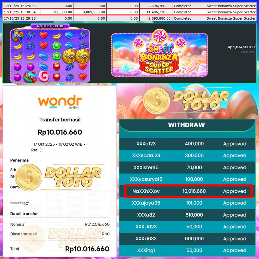 SELAMAT UNTUK MEMBER DOLLARTOTO dengan Username naXXhXXov berhasil meraih kemenangan besar di permainan SWEET BONANZA SUPER SCATTER – PRAGMATIC PLAY SLOT.