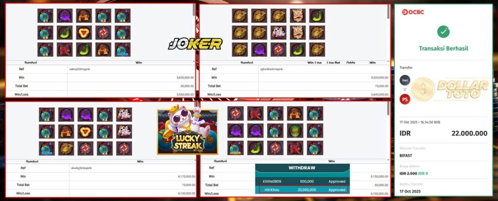 Dalam Permainan LUCKY STREAK >> JOKER GAMING SLOT. Dengan Jumlah Kemenangan Yang Diraih Sebesar Rp. 22.000.000,- yang langsung dibayarkan dengan tuntas tanpa adanya basa basi boskuu !! Segera daftarkan akun andaaa disini !! LINK TERSEDIA DI BAWAH INI !!