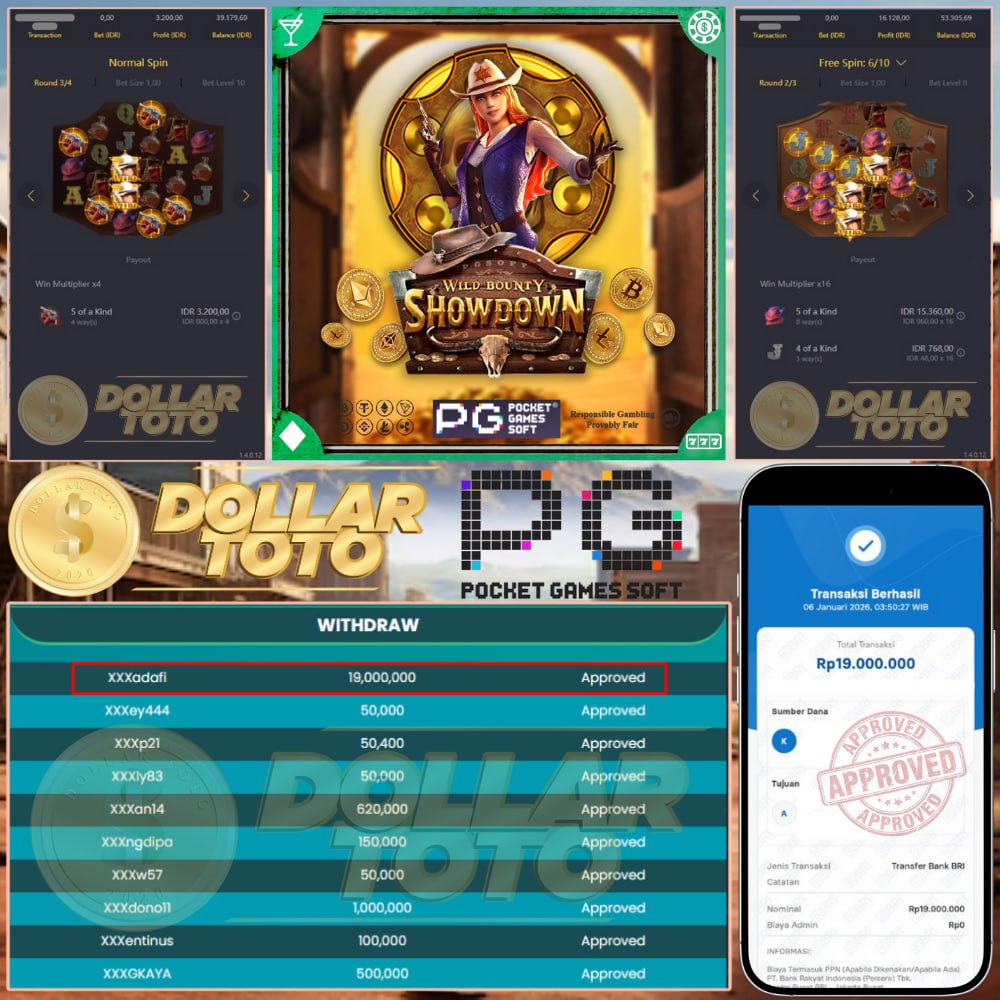 Selamat Kepada Member DOLLARTOTO dengan Username XXXadafi Yang Beruntung Mendapatkan Kemenangan Besar di DOLLARTOTO Dalam Permainan WILD BOUNTY SHOWDOWN >> PG SOFT. Dengan Jumlah Kemenangan Yang Diraih Sebesar Rp. 19.000.000,- yang langsung dibayar hingga tuntas.