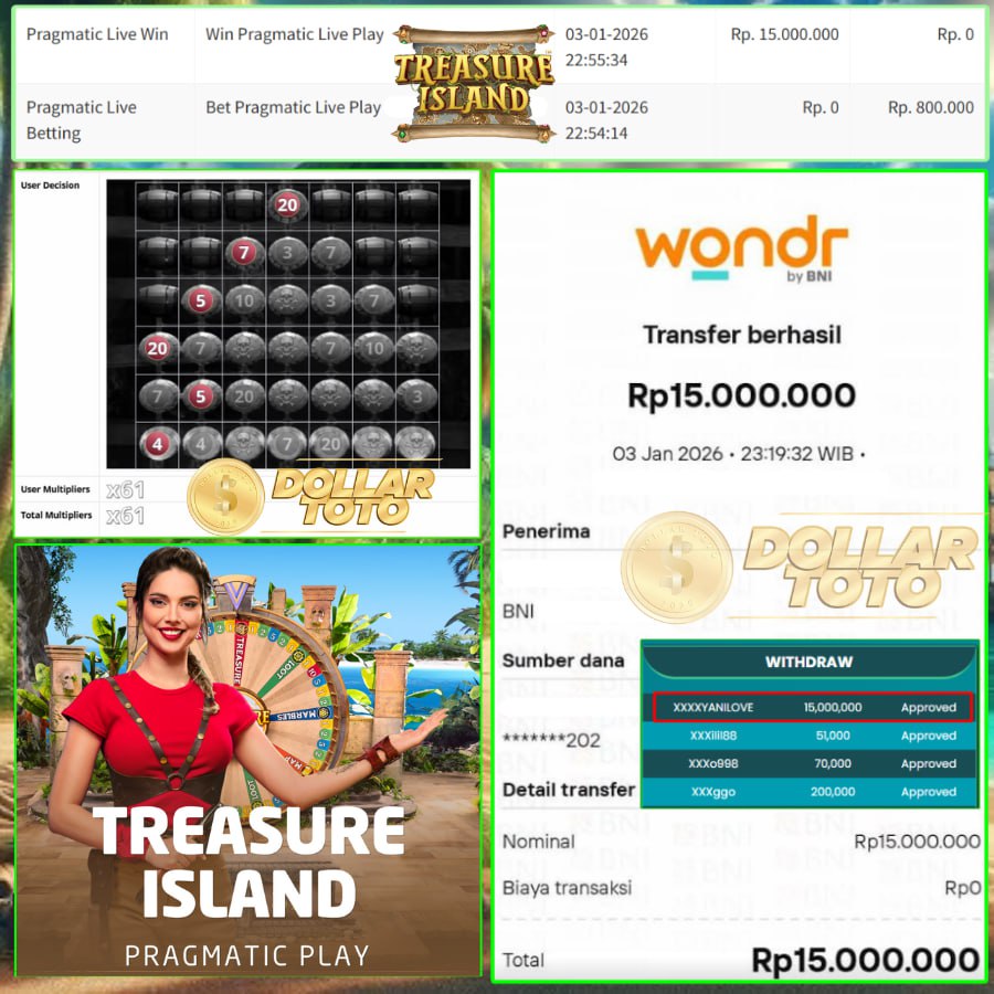 SELAMAT UNTUK MEMBER DOLLARTOTO dengan Username XXXXYANILOVE berhasil meraih kemenangan besar di permainan TREASURE ISLAND – PRAGMATIC PLAY LIVE.