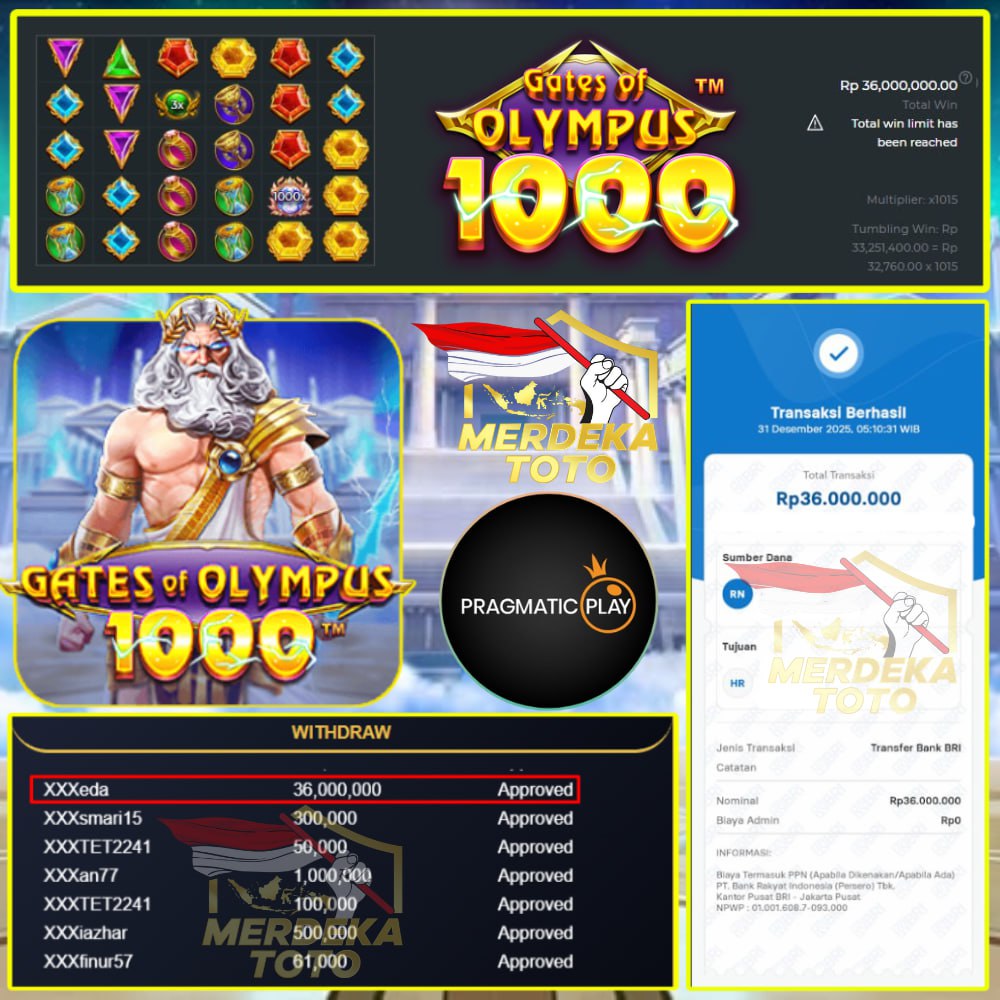 SELAMAT UNTUK MEMBER MERDEKATOTO dengan Username : XXXEDA berhasil meraih kemenangan besar di permainan GATES OF OLYMPUS 1000– PRAGMATIC PLAY SLOT.