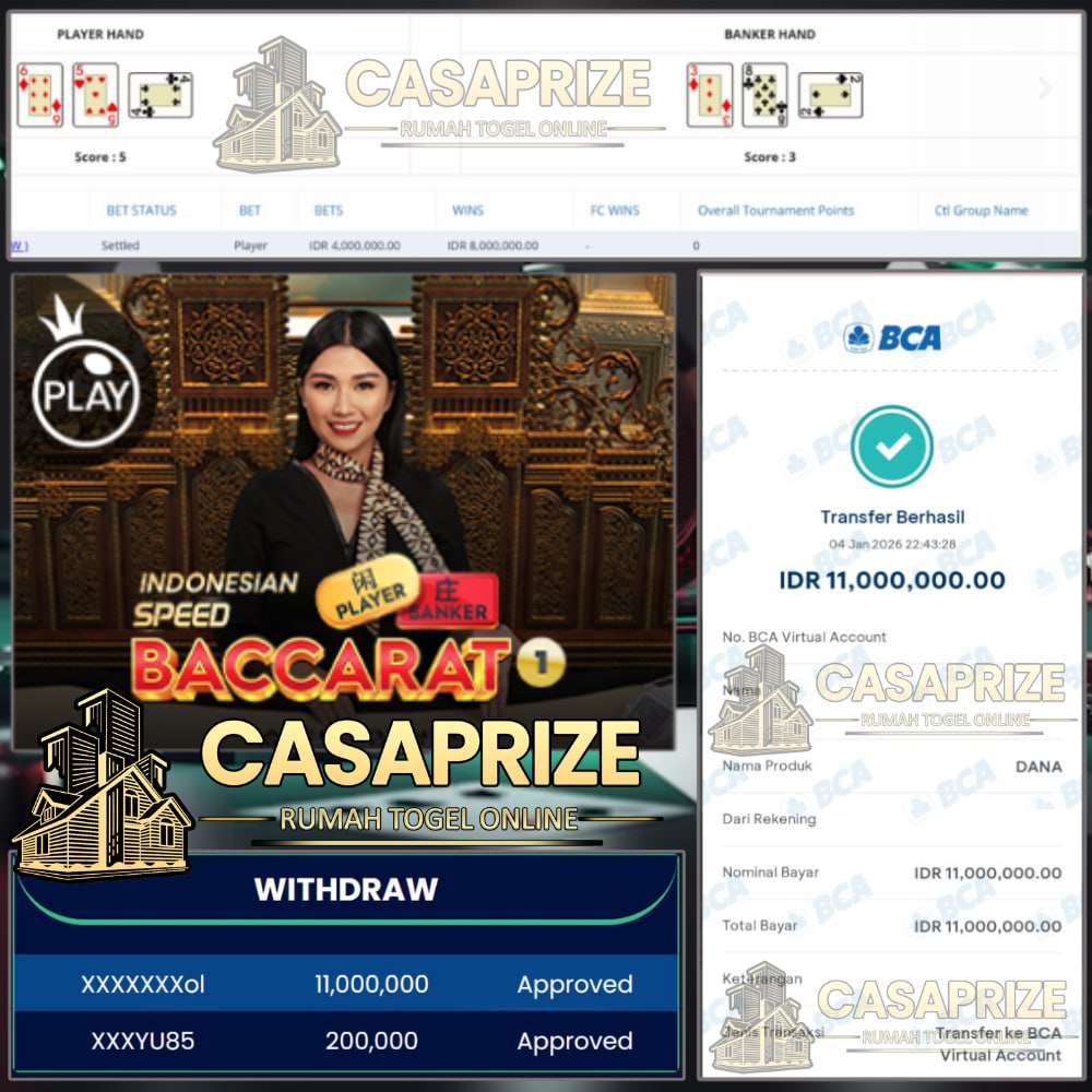 Selamat kepada bosku yang bermain di CASAPRIZE dengan user id XXXXXXol yang telah mendapatkan kemenangan besar di game INDONESIA SPEED BACCARAT 1 > PRAGMATIC LIVE CASINO.