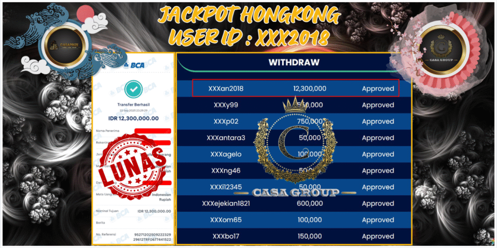 Selamat atas jackpot paus untuk member CASAPRIZE dengan user id : xxx18 yang telah berhasil menang pada pasaran HONGKONG sebesar Rp. 12.300.000 ,-