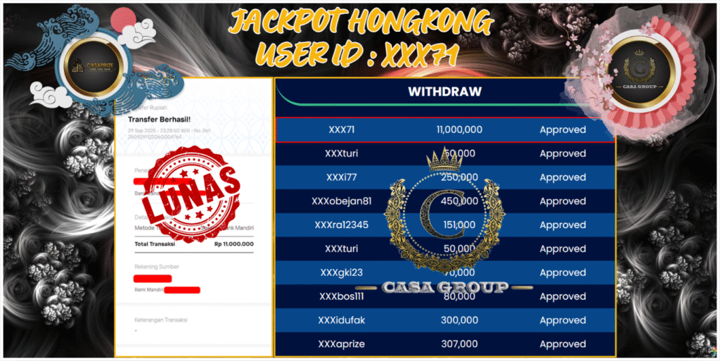 Selamat atas jackpot paus untuk member CASAPRIZE dengan user id : xxx71 yang telah berhasil menang pada pasaran HONGKONG sebesar Rp. 11.000.000 ,-