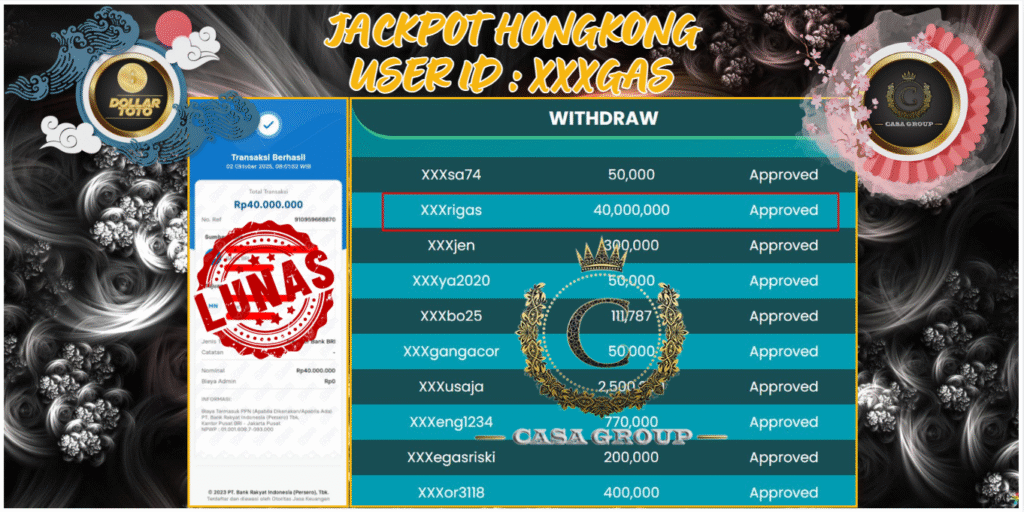 Selamat atas jackpot paus untuk member DOLLARTOTO dengan user id : xxxgas yang telah berhasil menang pada pasaran HONGKONG sebesar Rp. 40.000.000 ,-