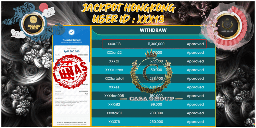 Selamat atas jackpot paus untuk member DOLLARTOTO dengan user id : xxx13 yang telah berhasil menang pada pasaran HONGKONG sebesar Rp. 11.300.000 ,-