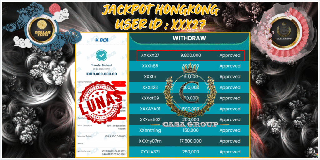 Selamat atas jackpot paus untuk member DOLLARTOTO dengan user id : xxx27 yang telah berhasil menang pada pasaran HONGKONG sebesar Rp. 9.800.000 ,-