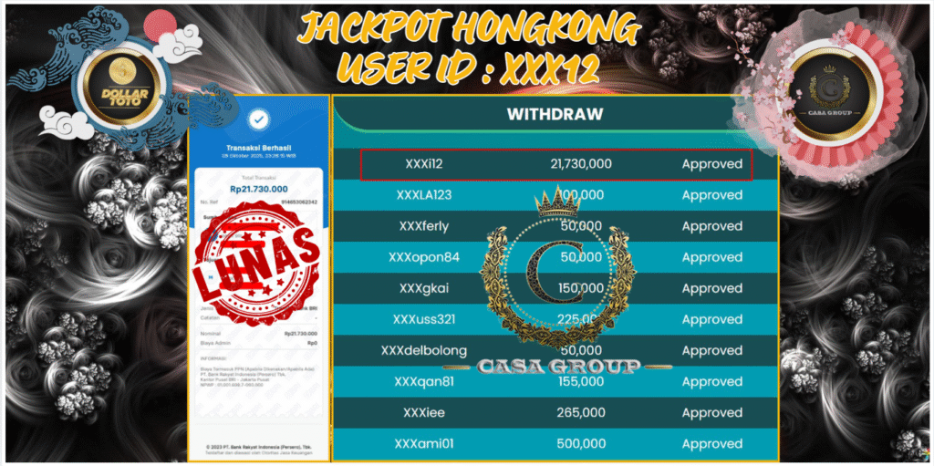 Selamat atas jackpot paus untuk member DOLLARTOTO dengan user id : xxx12 yang telah berhasil menang pada pasaran HONGKONG sebesar Rp. 21.730.000 ,-