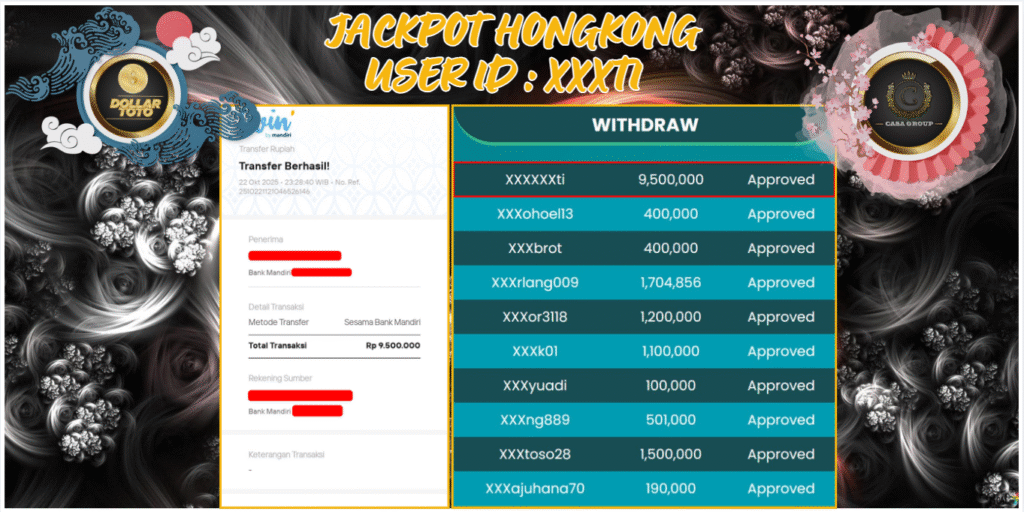 Selamat atas jackpot paus untuk member DOLLARTOTO dengan user id : xxxTI yang telah berhasil menang pada pasaran HONGKONG sebesar Rp. 9.500.000 ,-