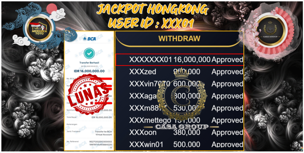 Selamat atas jackpot paus untuk member MERDEKATOTO dengan user id : xxx01 yang telah berhasil menang pada pasaran HONGKONG sebesar Rp. 16.000.000 ,-