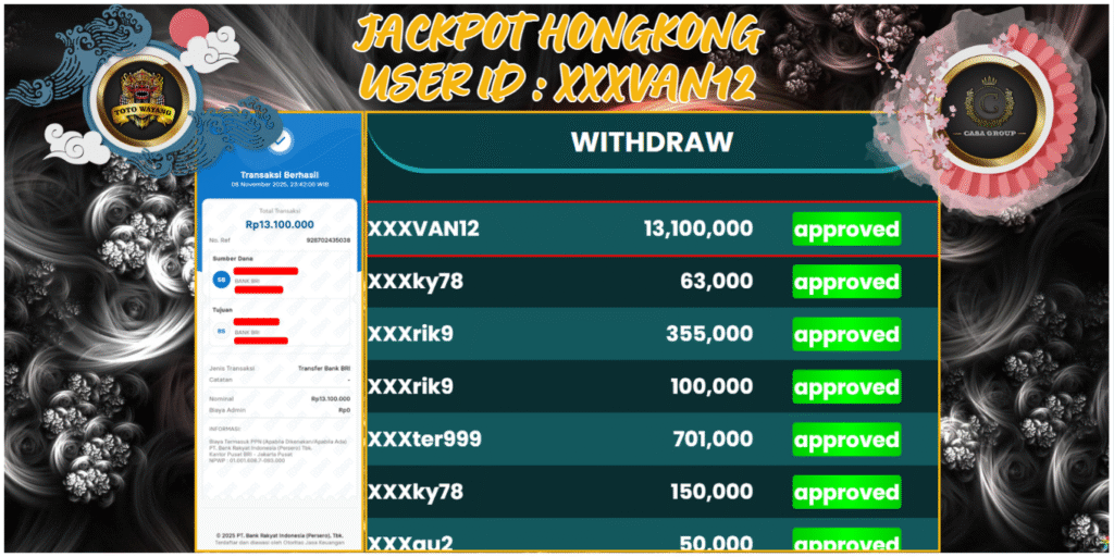 Selamat atas jackpot paus untuk member TOTOWAYANG dengan user id : xxxvan12 yang telah berhasil menang pada pasaran HONGKONG sebesar Rp. 13.100.000 ,-